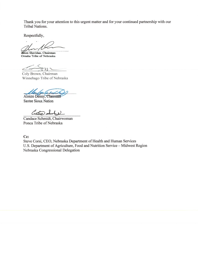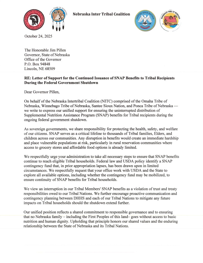 Letter of Support for the Continued Issuance of SNAP Benefits to Tribal Recipients During the Federal Government Shutdown