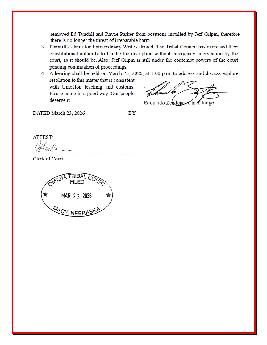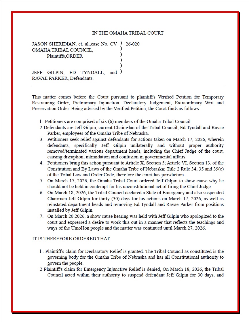 The Omaha Tribal Council is sharing the Omaha Tribal Court’s March 23, 2026, Order to provide clarity regarding the unlawful actions taken on March 17, 2026, and the resulting State of Emergency. In that Order, the Court declared that the Tribal Council, as presently constituted, is the governing body of the Omaha Tribe of Nebraska and holds the constitutional authority to govern the people. Jeff Gilpin remains under suspension and remains the subject of ongoing contempt proceedings in the Omaha Tribal Court. Any continued effort by him to claim authority on behalf of the Tribal government is unauthorized and should not be relied upon.