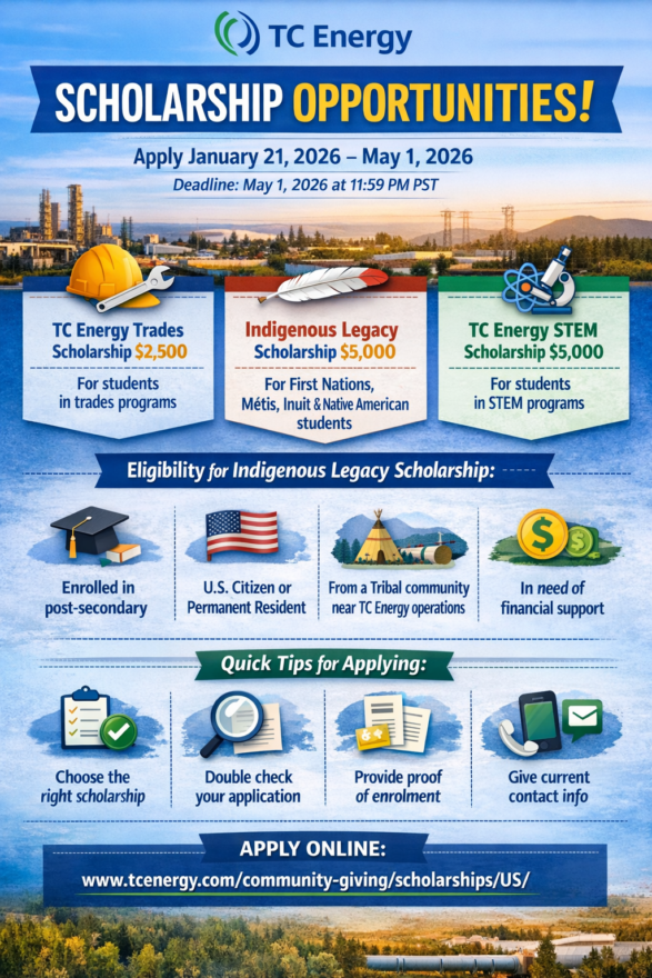 TC Energy offers three different scholarships: TC Energy Trades Scholarship ($2,500), TC Energy Indigenous Legacy Scholarship ($5,000), and TC Energy STEM Scholarship ($5,000), offered to students enrolled in a science, engineering, technology, or math (STEM) program. Students are not eligible to receive this scholarship more than once.