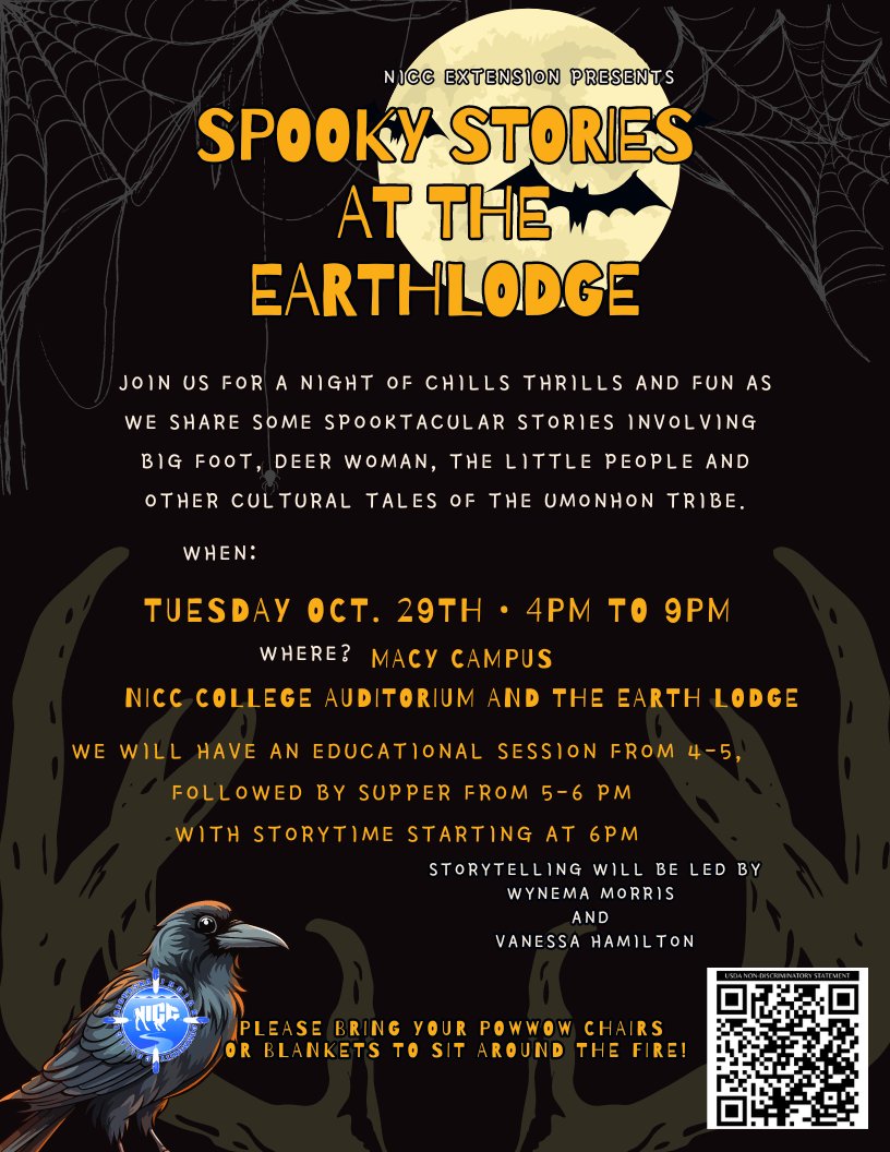Spooky Stories at the Earthlodge Tuesday, October 29th, 2024 4 PM until 9 PM Macy Campus, Macy, Nebraska NICC College Auditorium and the Earth Lodge Supper from 5-6 PM Story time begins at 6 PM